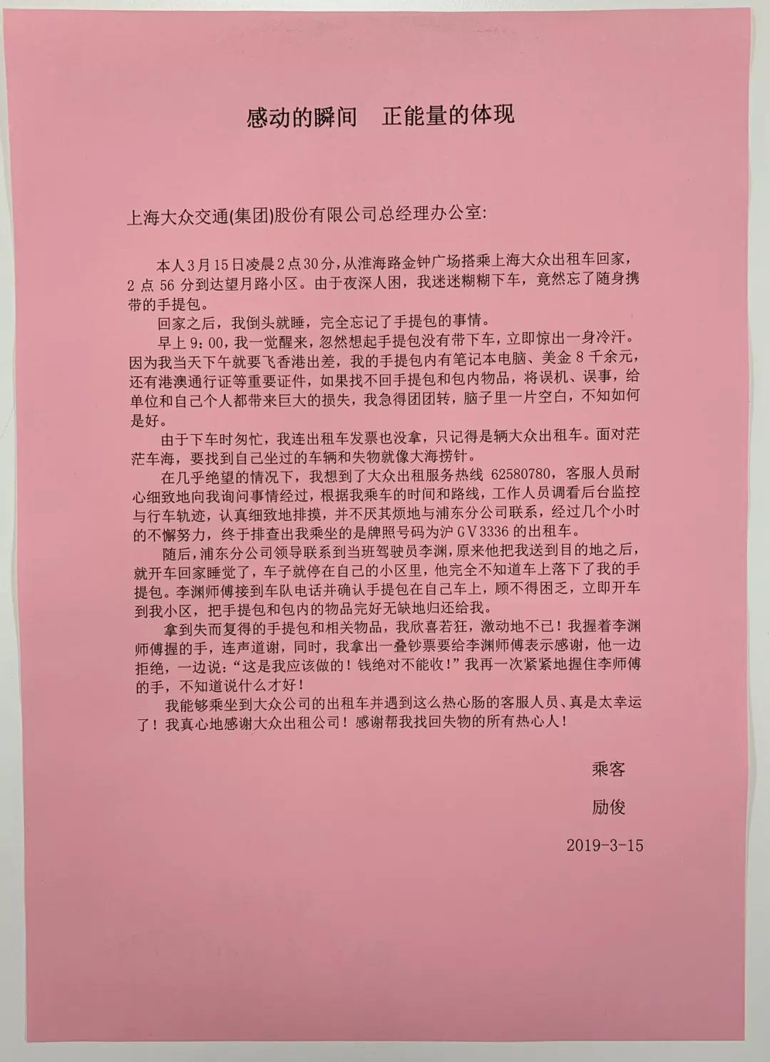 新民晚报讯(首席记者 曹刚 通讯员 赵巧珍)近日,市民励先生专程来到j9九游会出租租赁公司,送上锦旗和感谢信,感谢热心的j9九游会职工10天前帮他找回手提包,内有8000多美元和港澳通行证等重要证件。