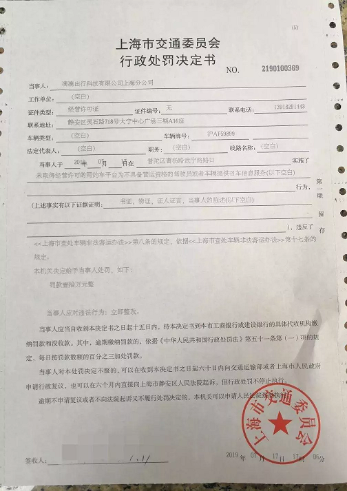 7月17日,上海市交通委执法总队向滴滴出行上海分公司再一次开出10万元罚单,这已经是滴滴在上海连续第十天被罚。